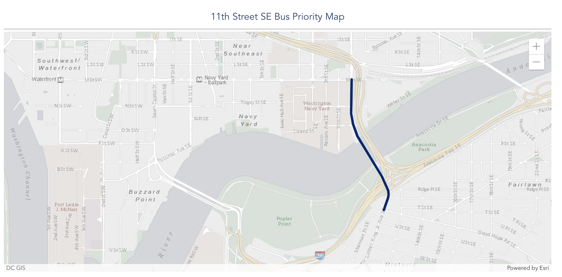 “The 11th St SE bus priority project will focus on improvements to fixed route urban bus operations and safety for vulnerable users on this critical connection across the Anacostia River. The 11th Street Bridge complex serves several high ridership bus routes and, during the development of the Bus Priority Plan, was found to have high levels of passenger delay, making it a priority for further investigation and improvement. This corridor was fundamentally changed between 2009 and 2012 with the construction of the new 11th Street Bridges complex and this project will identify ways to further refine its operations and cohesion with the broader street network.”