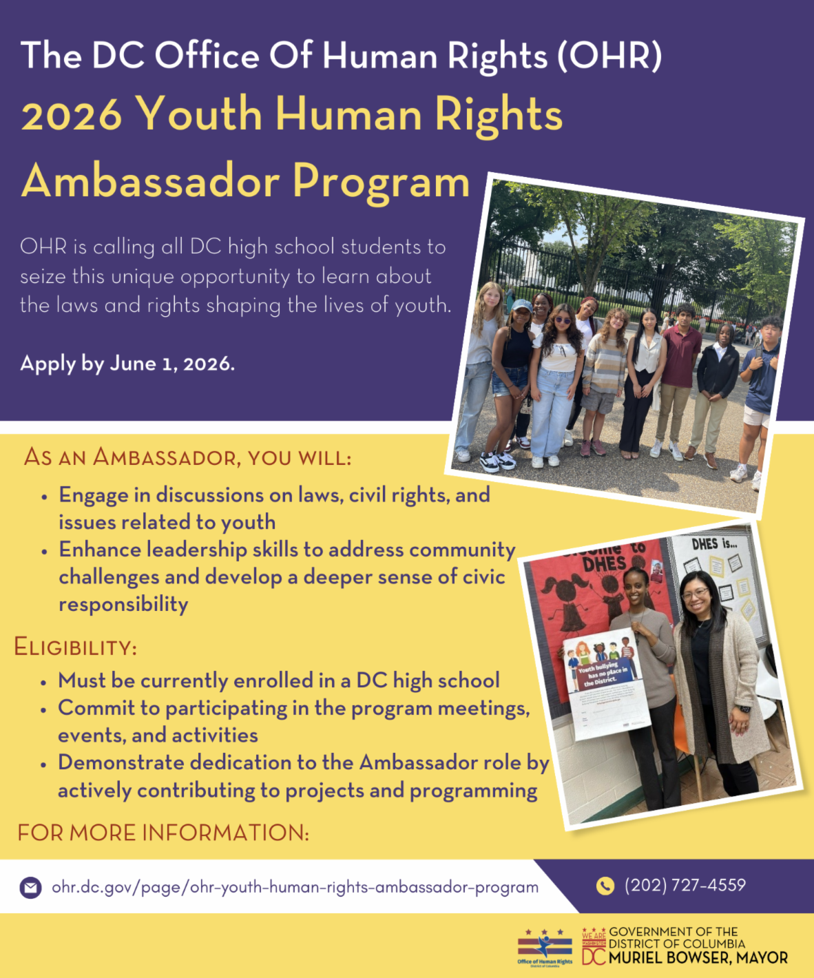 DC high school students looking to lead and make an impact are invited to apply for the 2026 Youth Human Rights Ambassador (YHRA) Program with the DC Office of Human Rights.