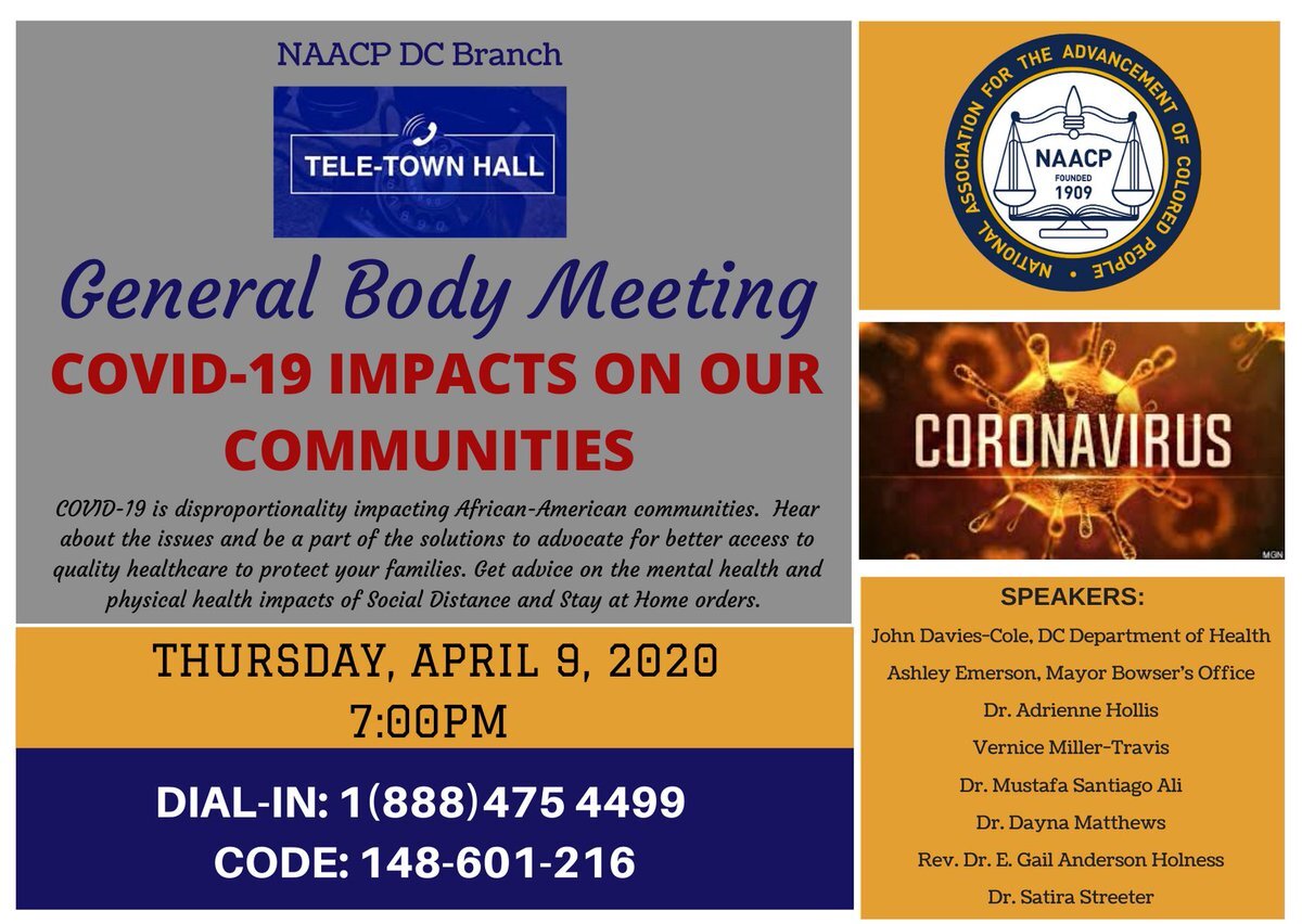 April 9 | NAACP DC Branch Tele-Town Hall on COVID-19 EVENTSThe Advoc8teApril 10, 2020Comment Facebook0 Twitter LinkedIn0 Reddit Tumblr Pinterest0 0 Likes