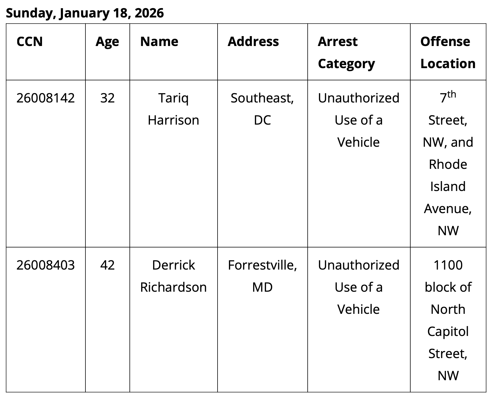 The Metropolitan Police Department announces arrests in recent Theft One (Stolen Auto) and Unauthorized Use of a Vehicle offenses in Washington, DC.