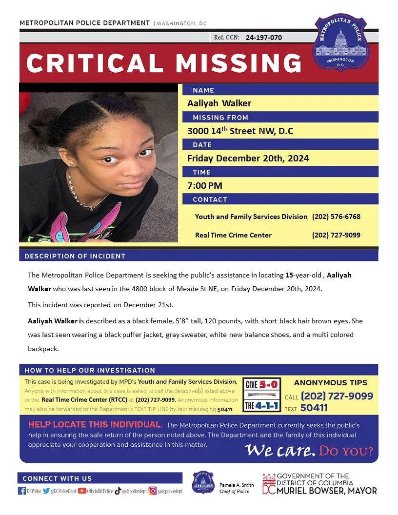 15-year-old , Aaliyah Walker who was last seen in the 4800 block of Meade St NE, on Friday December 20th, 2024. This incident was reported on December 21st. Have info? Call (202) 727-9099/Text 50411