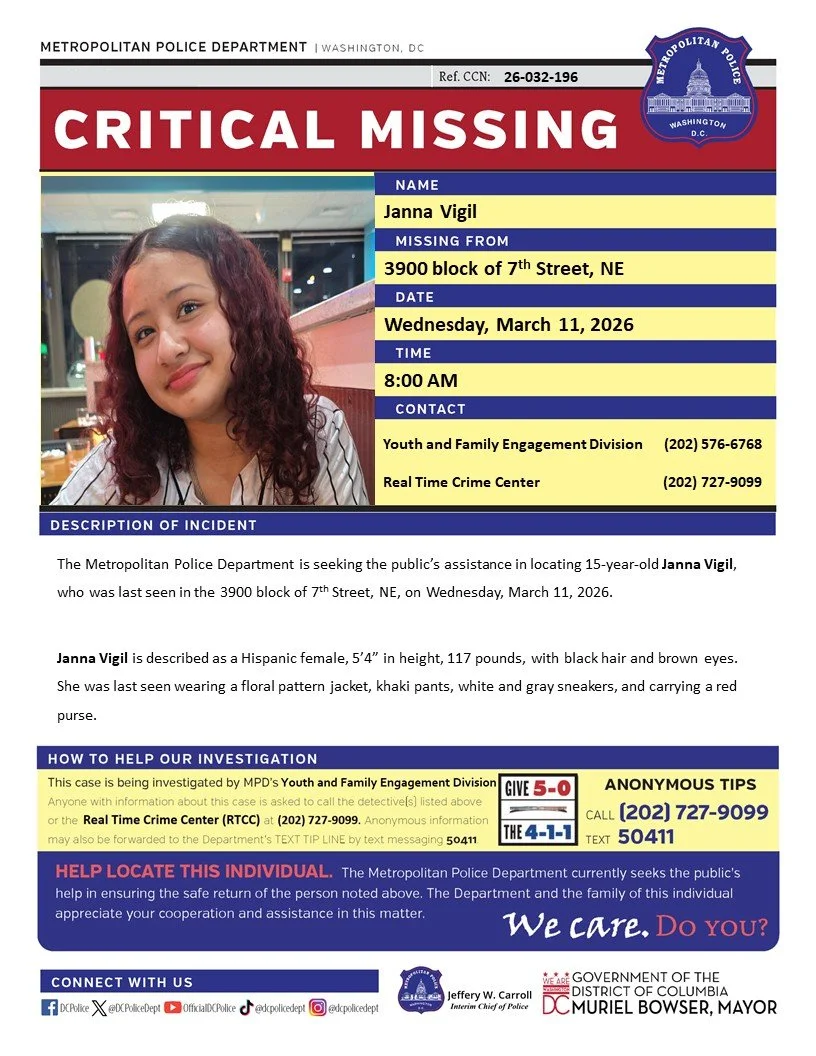 Last seen in the 3900 block of 7th Street, NE, on Wednesday, March 11, 2026.