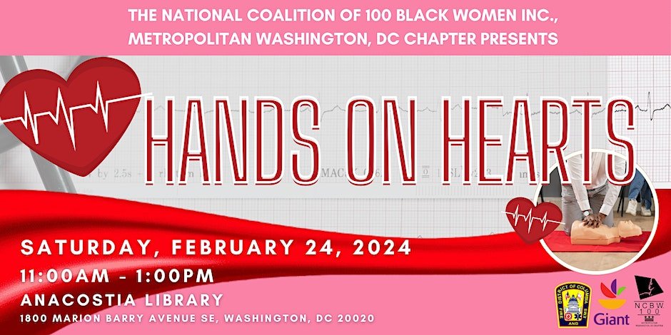 Free CPR training at Anacostia Library, Feb. 24 at 11 AM. Learn Hands-On-Heart technique, get heart-healthy tips, and win a Giant gift card!