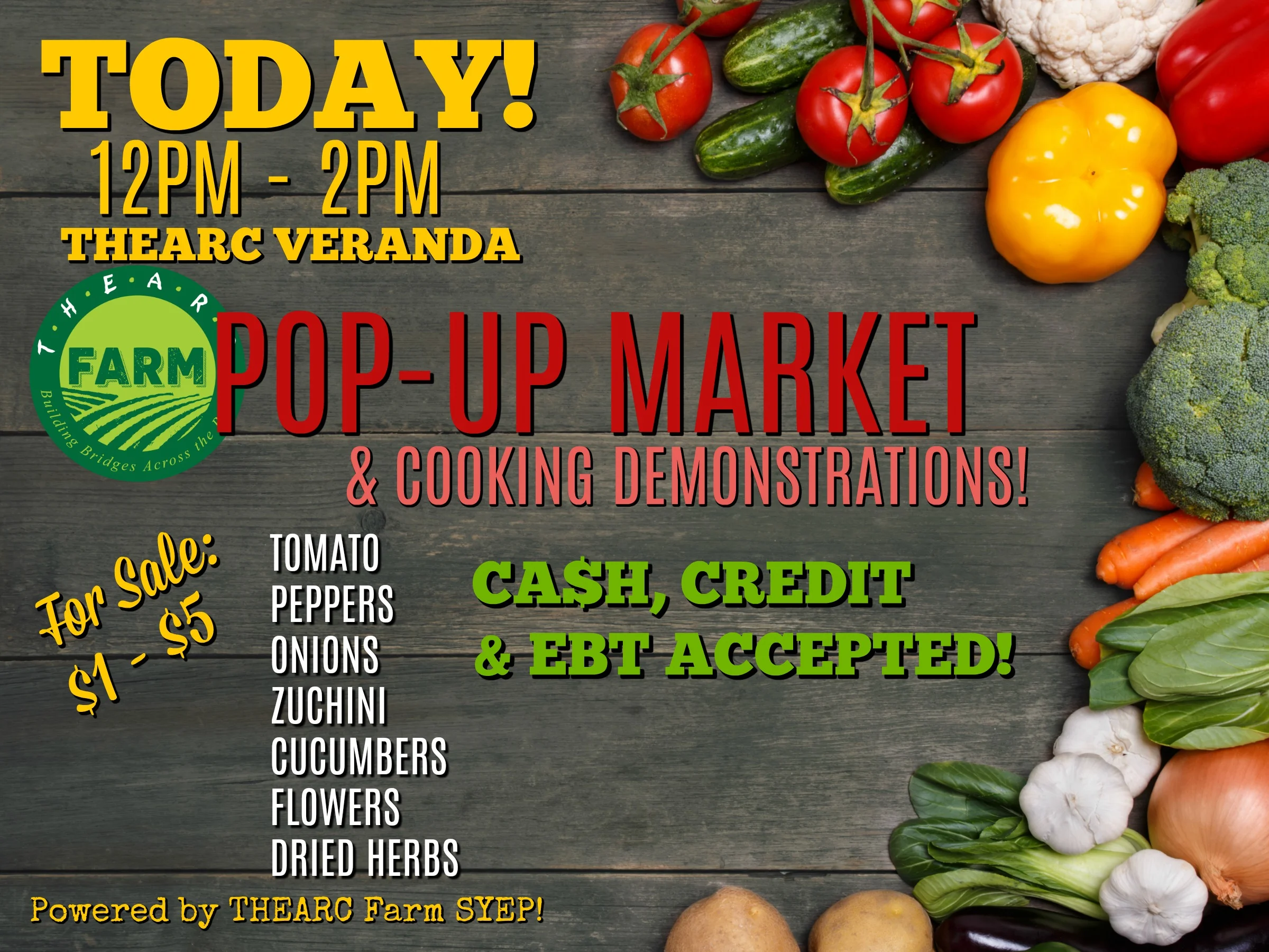SURPRISE! If you happen to be around the Town Hall Education Arts Recreation Campus (THEARC) today around lunch time, join us on THEARC's “veranda” (area in front of the lobby) for a POP-UP PRODUCE MARKET with cooking demonstrations by THEARC Farm’s SYEP! Market is from 12pm – 2pm. Get fresh produce grown right on THEARC Farm for less than $5! Cash, credit & EBT are accepted! Spread the word! 1901 Mississippi Ave SE.