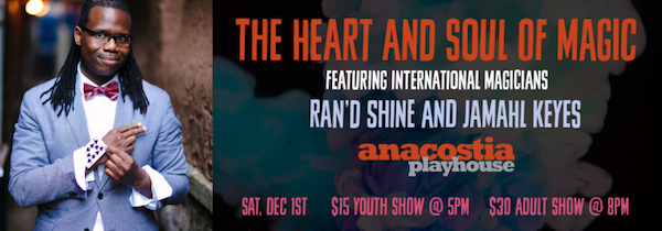 The Heart & Soul of Magic returns to the Anacostia Playhouse to kick off the Holiday season! International Magicians Ran’D Shine and Jamahl Keyes are known for “A Different Kind of Deception.” Their show combines music, sleight of hand and psychological illusions that will have you questioning reality in an intimate space. The Heart & Soul of magic is an unforgettable show that audiences of all ages will enjoy. Adults’ minds will be blown and children will be amazed. One audience member described the show as “Mesmerizing and entertaining… A must see act.” Bring the entire family and kick off the most Magical time of the year.