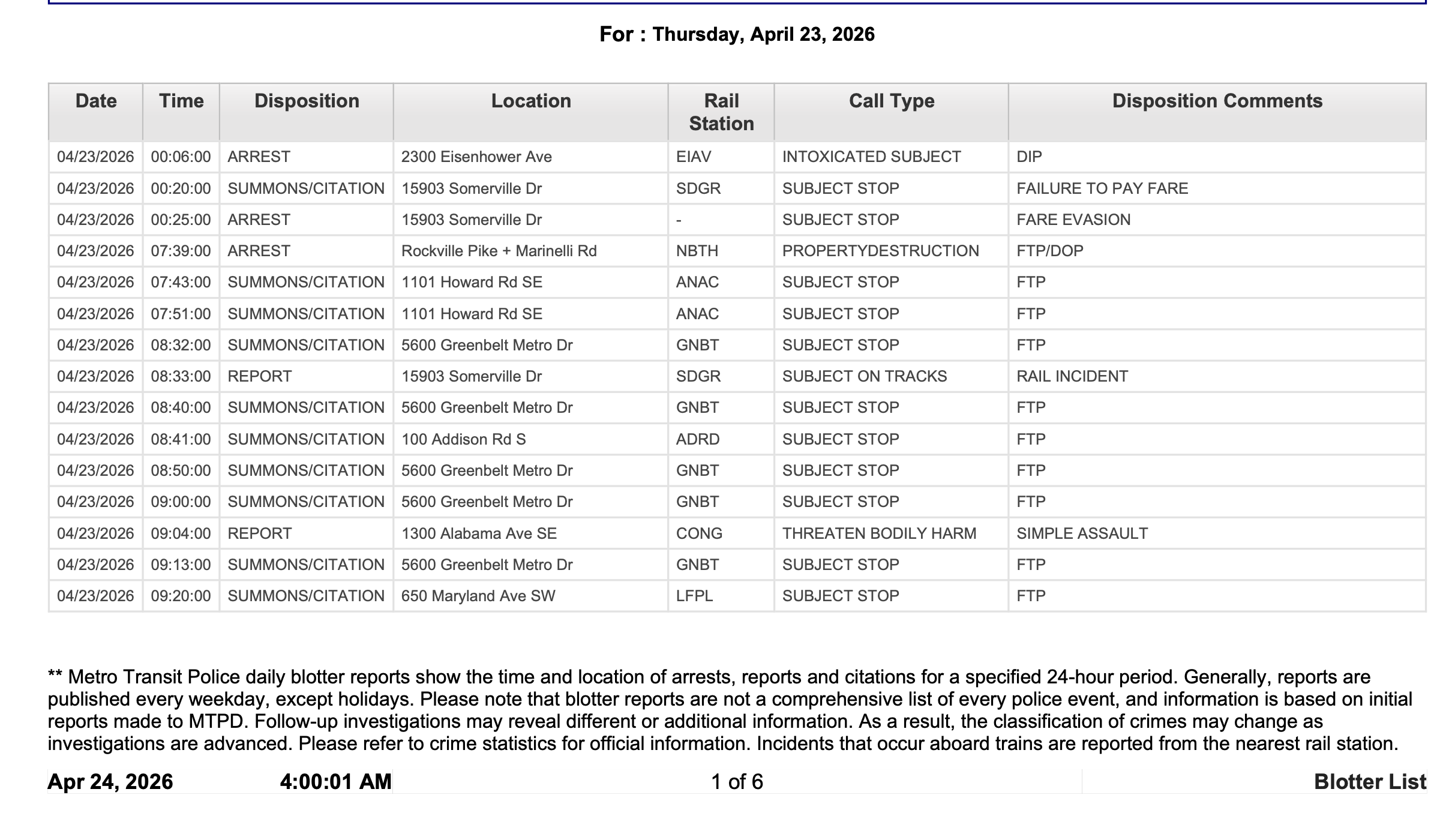 Metro Transit Police Daily Blotter for April 23, 2026