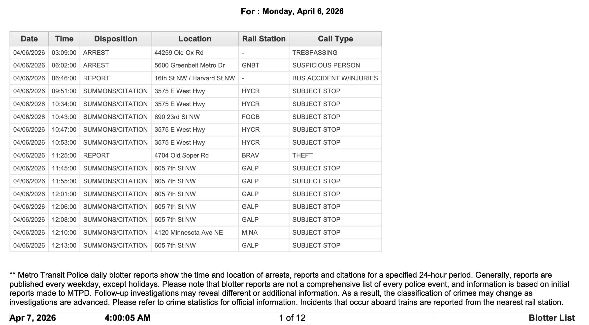 Metro Transit Police daily blotter reports show the time and location of arrests, reports and citations for a specified 24-hour period. Generally, reports are published every weekday, except holidays. Please note that blotter reports are not a comprehensive list of every police event, and information is based on initial reports made to MTPD. Follow-up investigations may reveal different or additional information. As a result, the classification of crimes may change as investigations are advanced. Please refer to crime statistics for official information. Incidents that occur aboard trains are reported from the nearest rail station.