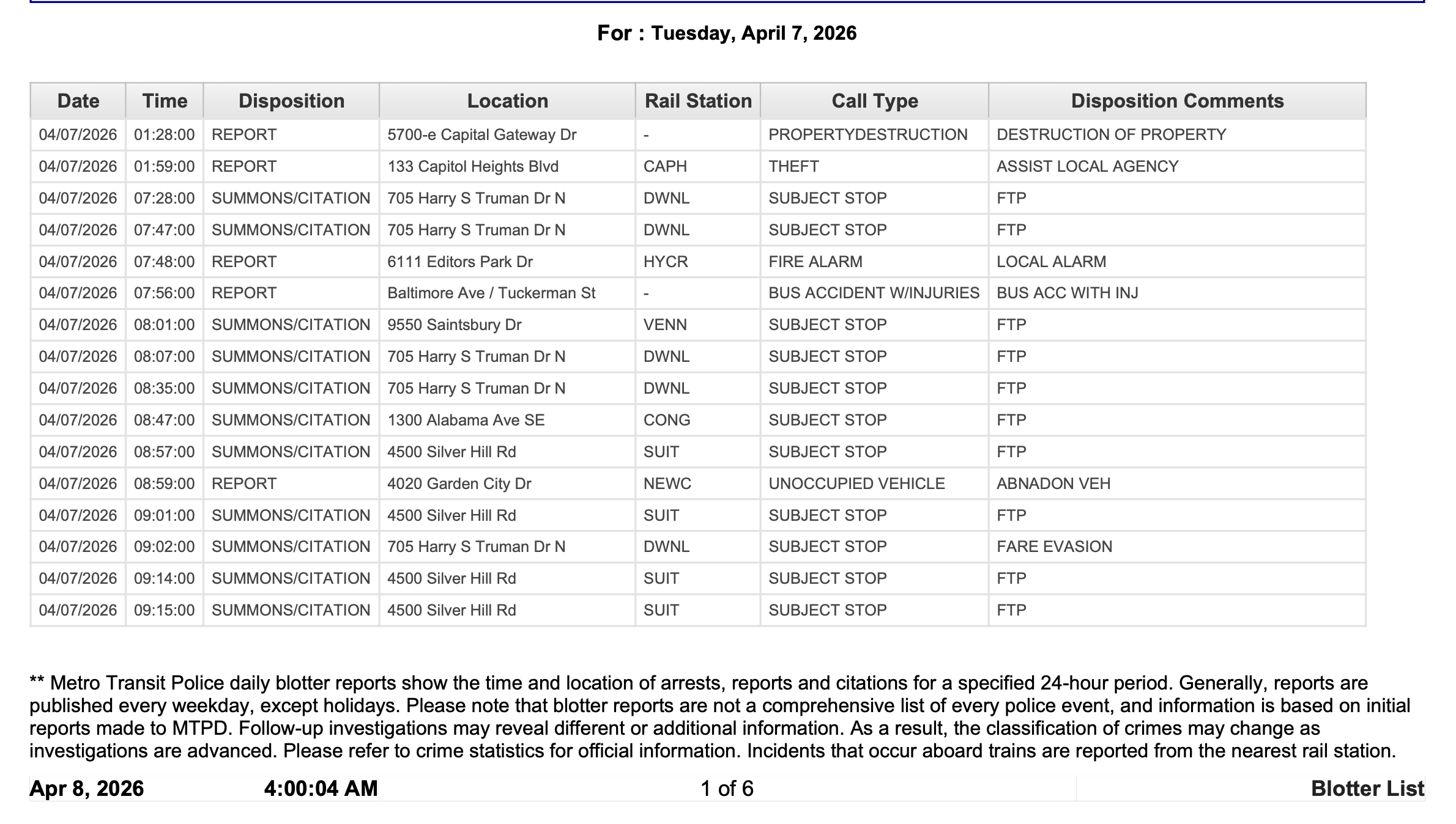 Metro Transit Police daily blotter reports show the time and location of arrests, reports and citations for a specified 24-hour period. Generally, reports are published every weekday, except holidays. Please note that blotter reports are not a comprehensive list of every police event, and information is based on initial reports made to MTPD. Follow-up investigations may reveal different or additional information. As a result, the classification of crimes may change as investigations are advanced. Please refer to crime statistics for official information. Incidents that occur aboard trains are reported from the nearest rail station.