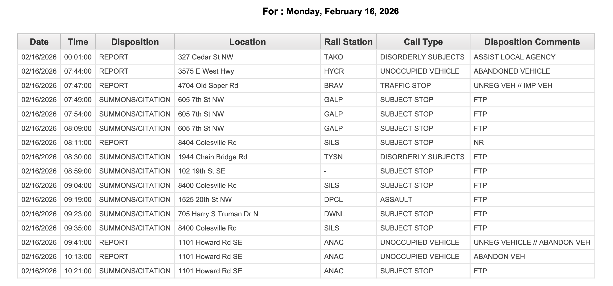 Metro Transit Police Daily Blotter for Feb 16, 2026