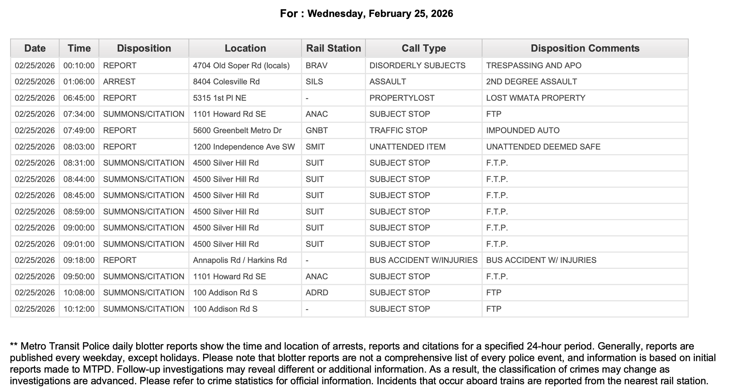 Metro Transit Police Daily Blotter for Feb 25, 2026