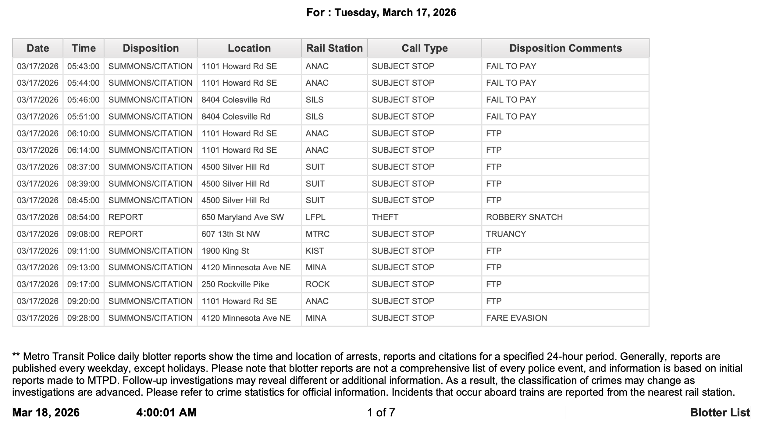 Metro Transit Police Daily Blotter for March 17, 2026