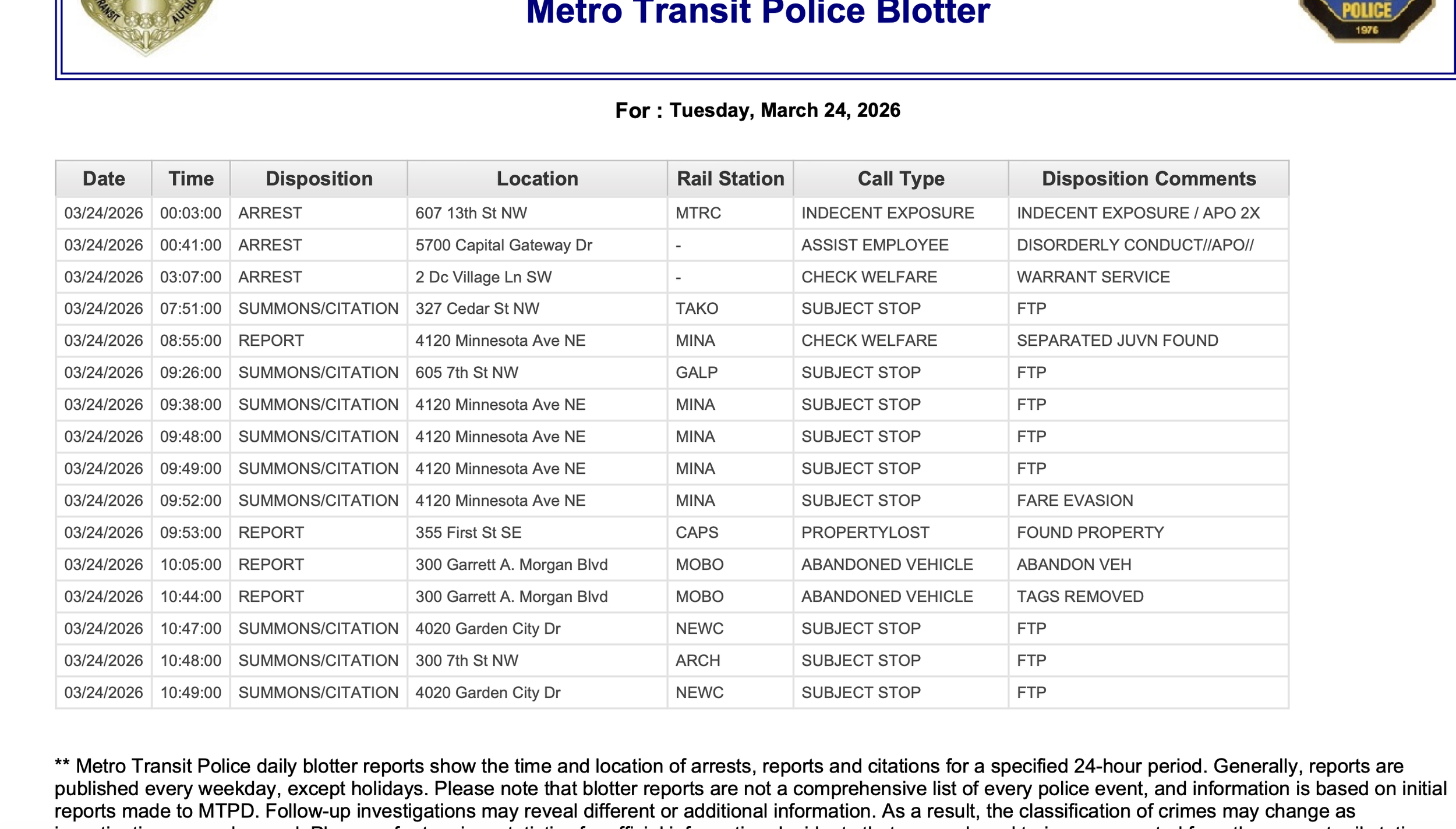 Metro Transit Police Daily Blotter for March 24, 2026