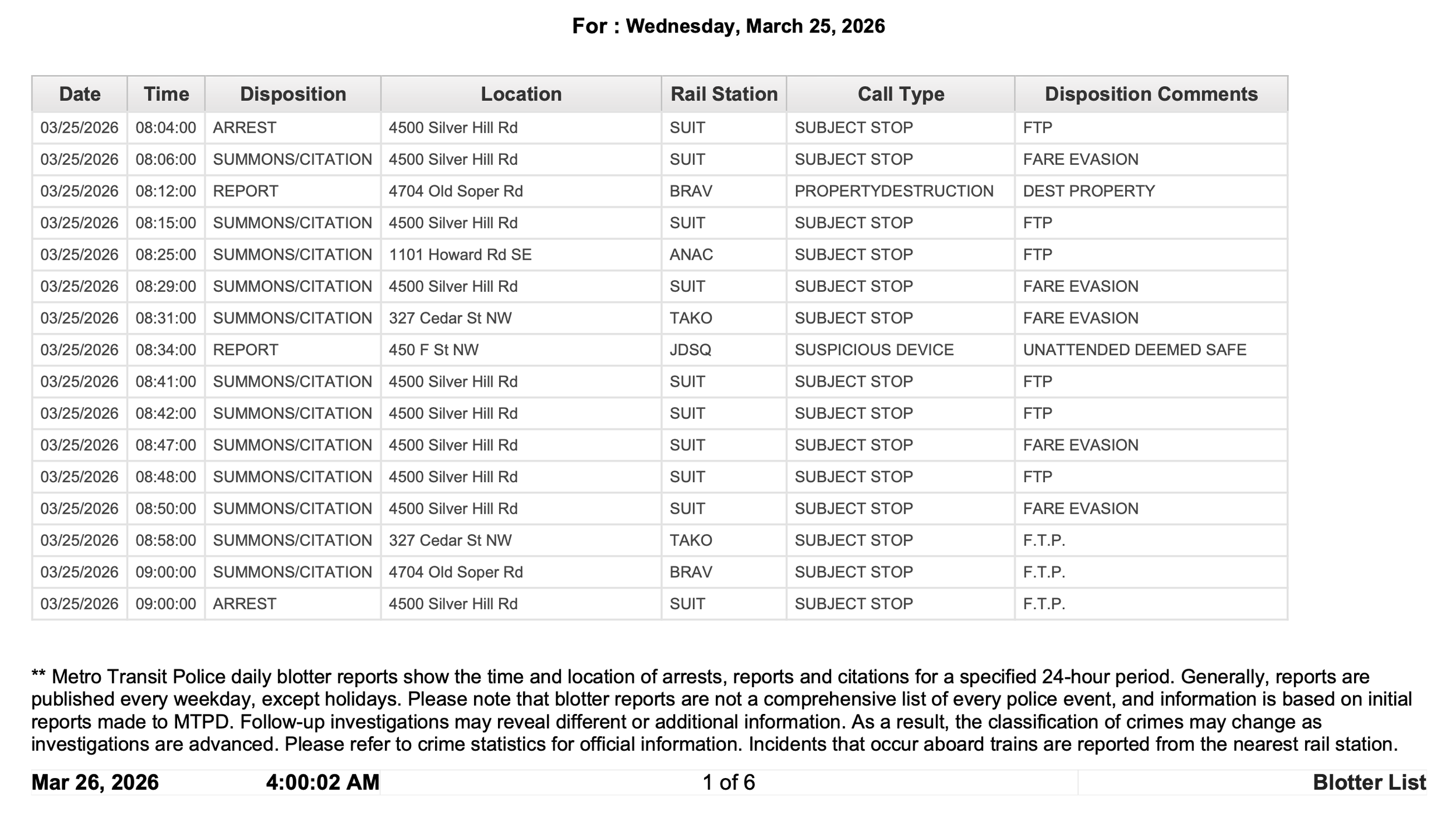 Metro Transit Police Daily Blotter for March 25, 2026