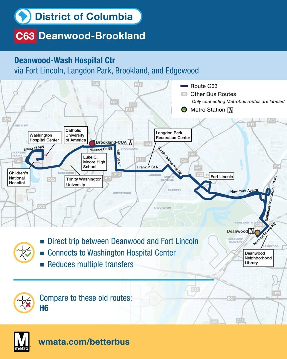 Big changes are coming to make getting around easier. The new Better Bus network is designed to get you where you live, work, and play more efficiently. One of the new additions, Route C63, offers a direct connection between Deanwood and Fort Lincoln—no more multiple transfers required. Learn more at wmata.com/BetterBus.