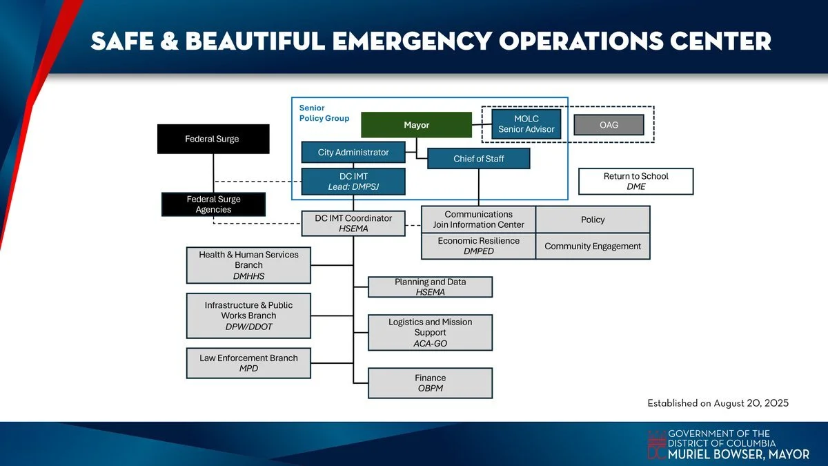 The Mayor issued a Mayor’s Order that continues the work of the Safe and Beautiful Emergency Operations Center (SBEOC) in managing the District’s response to the Safe and Beautiful Task Force, established by the President, as well as the Presidential declaration of emergency. During and after the Presidential emergency, the SBEOC will manage the District’s response, coordinate centralized communications, and ensure coordination with federal law enforcement to the maximum extent allowable by law within the District.