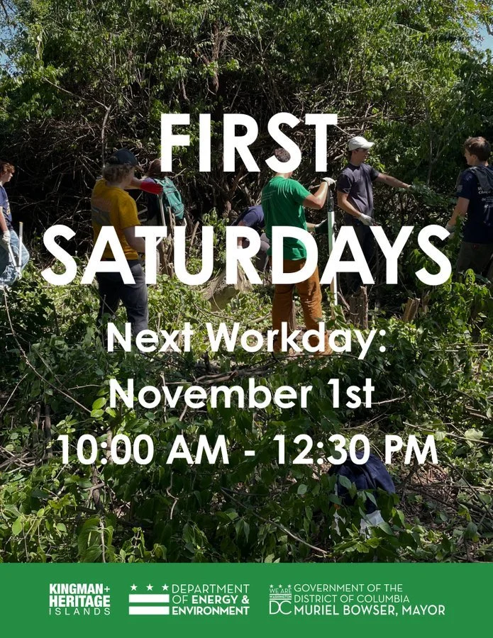 This Saturday, November 1st, volunteers are invited to join the First Saturday Invasive Plant Management Workday from 10:00 AM to 12:30 PM. Participants will help remove invasive plants near the entrance of Kingman + Heritage Islandsand along the Anacostia River Trail — supporting efforts to restore the area’s native ecology.