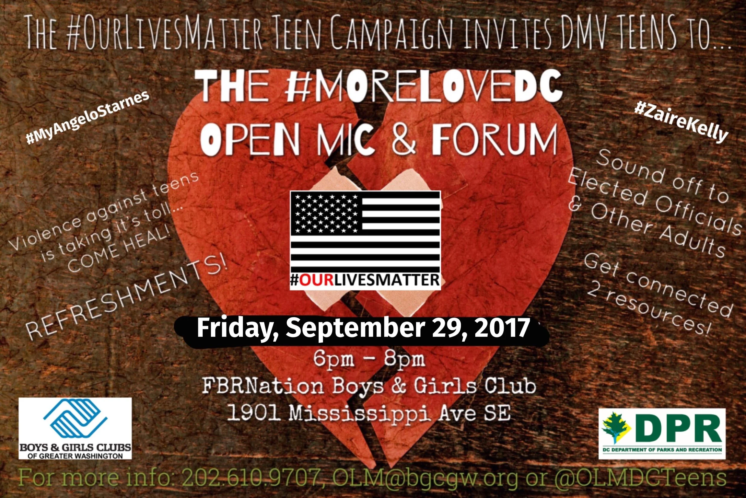 SEPT 29 | #MORELOVEDC OPEN MIC & FORUM MY PICKThe Advoc8teSeptember 28, 2017Boys & Girls Club FBR BranchFREE EVENTS, THEARC, YOUTHComment Facebook0 Twitter LinkedIn0 Reddit Tumblr Pinterest0 0 Likes